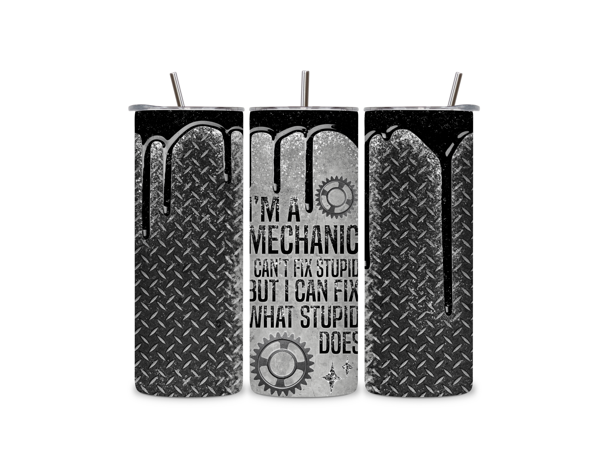 The tumbler features a humorous quote, "I'm a Mechanic I Can Fix What Stupid Does", making it an ideal gift for yourself or your mechanic friend. It's also perfect for carrying hot or cold drinks, whether you're at home, office or on the go.