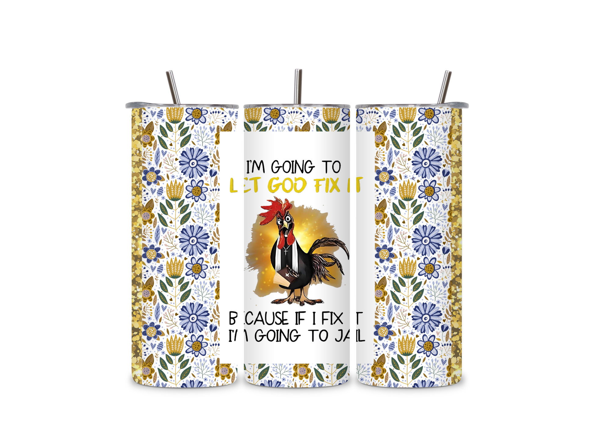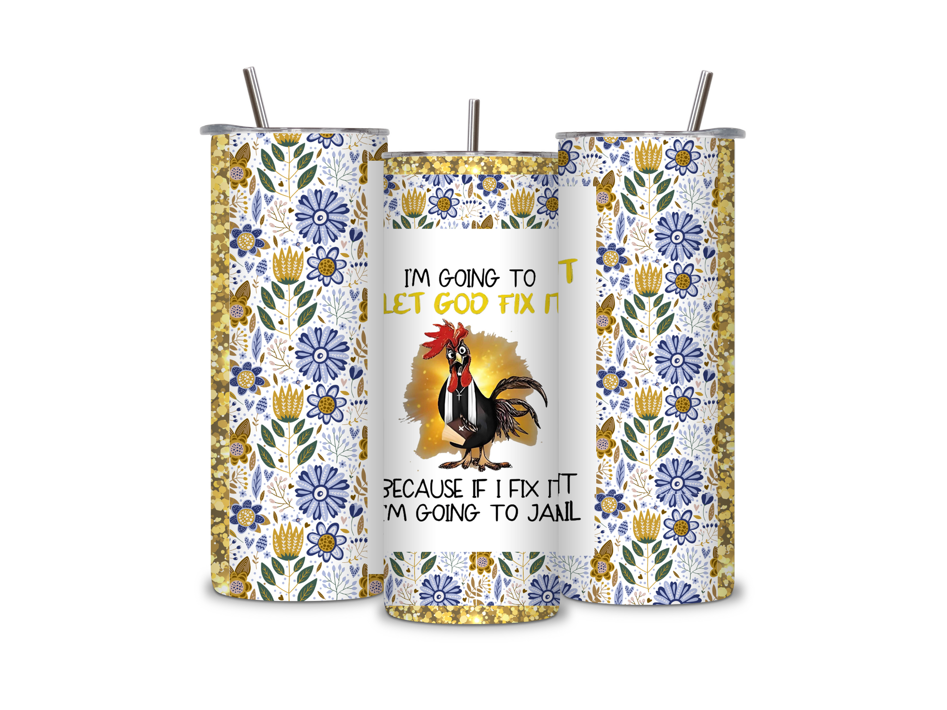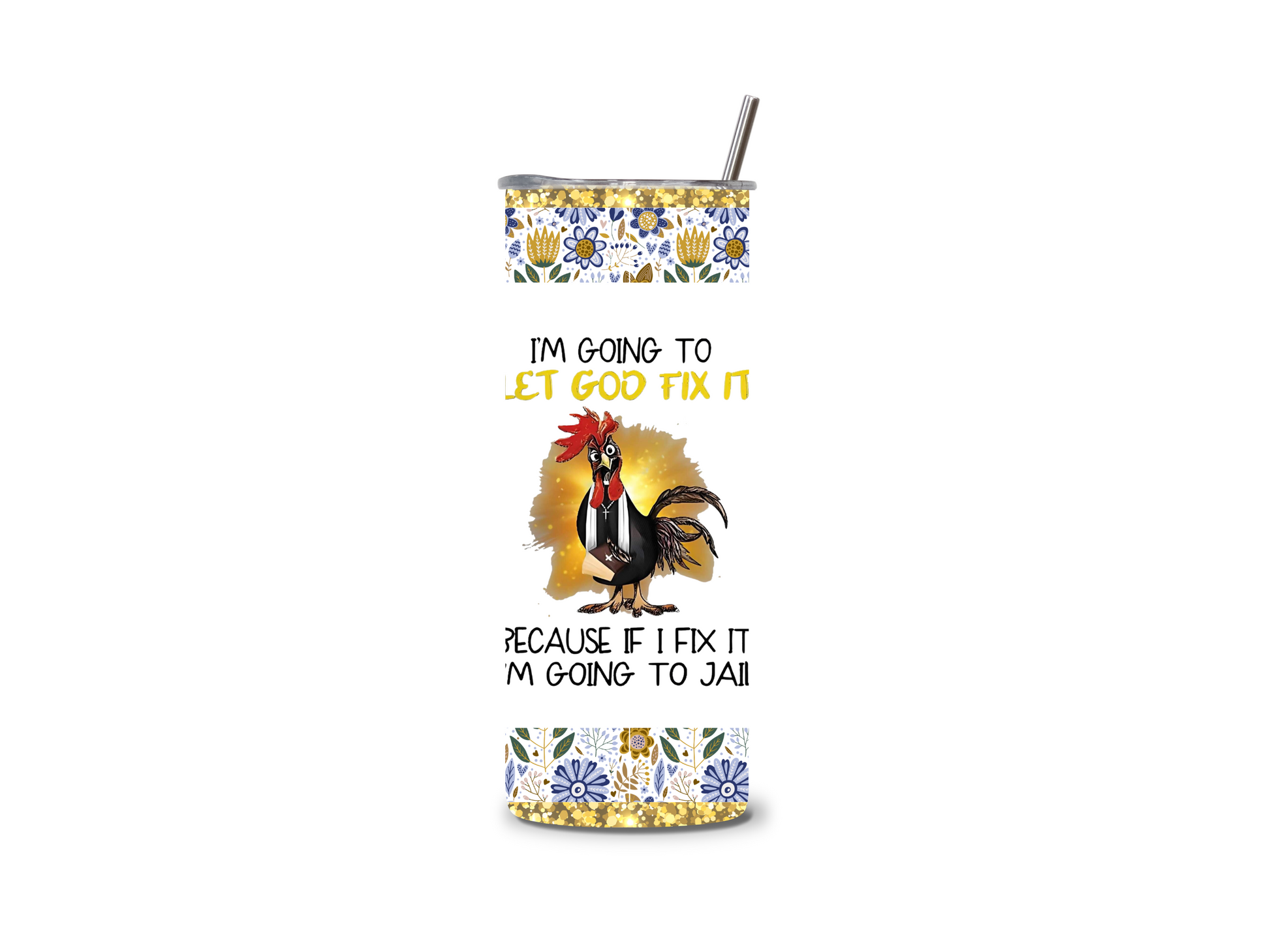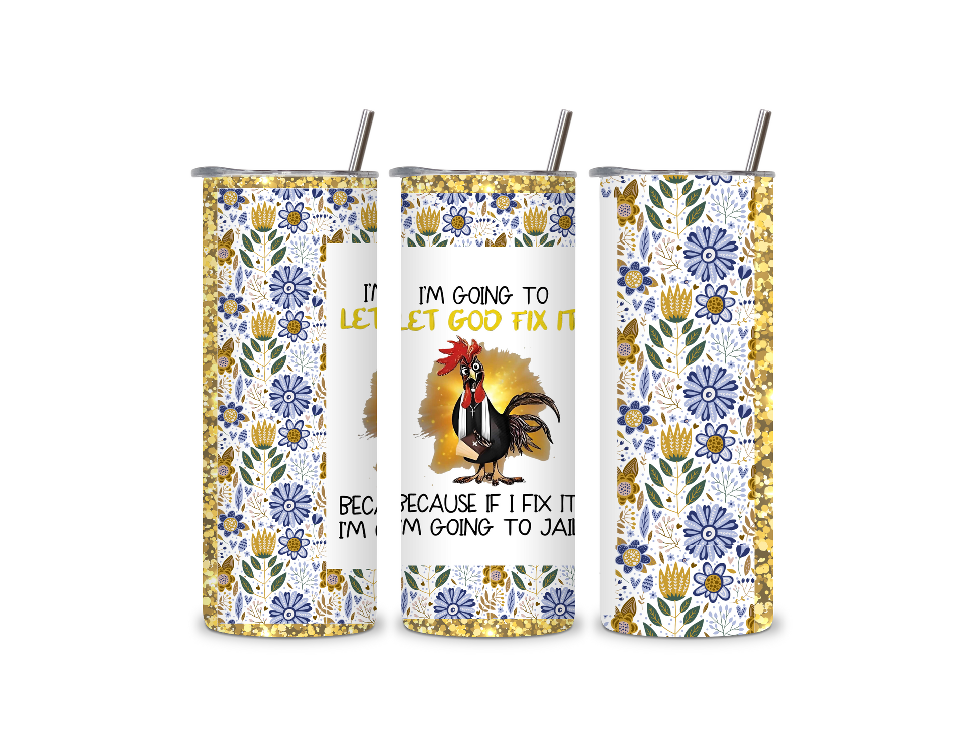 The "Let God Fix It 20 oz Skinny Tumbler Stainless Steel" is a captivating and faith-inspired drinkware piece. Adorned with a central image of a rooster holding a Bible, the tumbler features a humorous yet profound message: "I am gonna let God fix it, because if I fix it, I am going to jail." Surrounding the tumbler is a vibrant display of colorful flowers, creating a visually appealing and lively design. A touch of luxury is added with a gold glitter border, enhancing the overall aesthetic. This stainless steel tumbler not only keeps your beverages at the perfect temperature but also serves as a unique and uplifting accessory. It's a delightful blend of spirituality, humor, and artistic flair, making it a must-have item for those seeking a meaningful and stylish way to hydrate. Available for sale now, it's a perfect gift or personal treat.